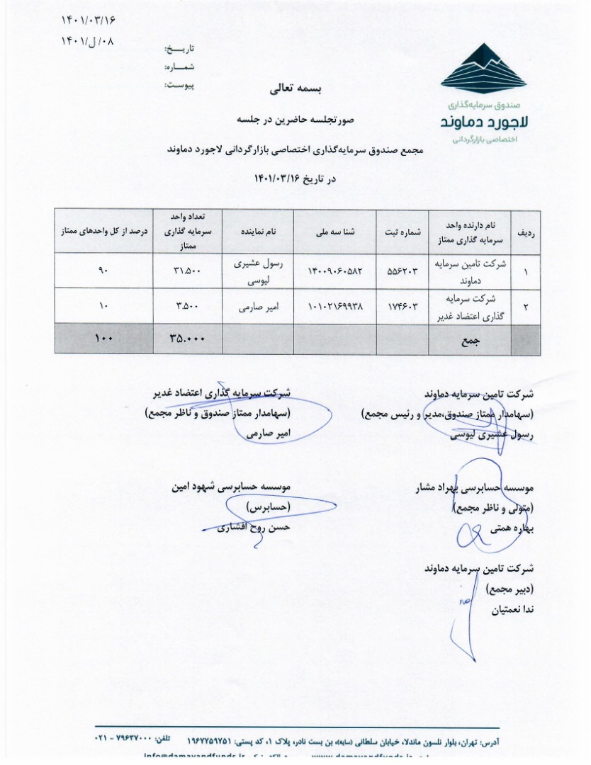 لیست حاضرین در مجمع صندوق بازارگردانی لاجورد دماوند مورخ ۱۴۰۱/۰۳/۰۴ جهت تغییر بند امیدنامه افزایش سقف صندوق از ۳۰،۰۰۰،۰۰۰ به ۱۲۰،۰۰۰،۰۰۰ واحد