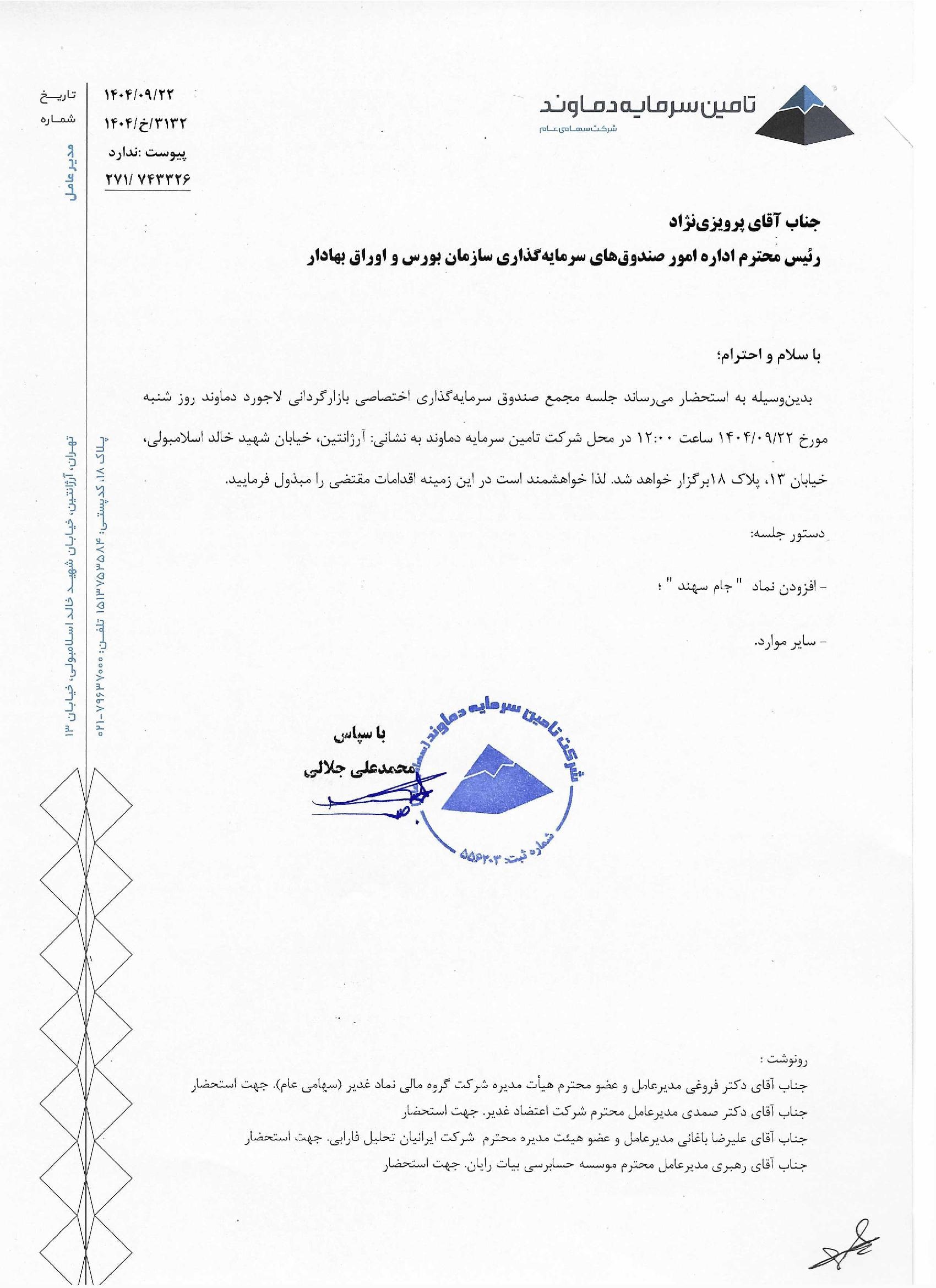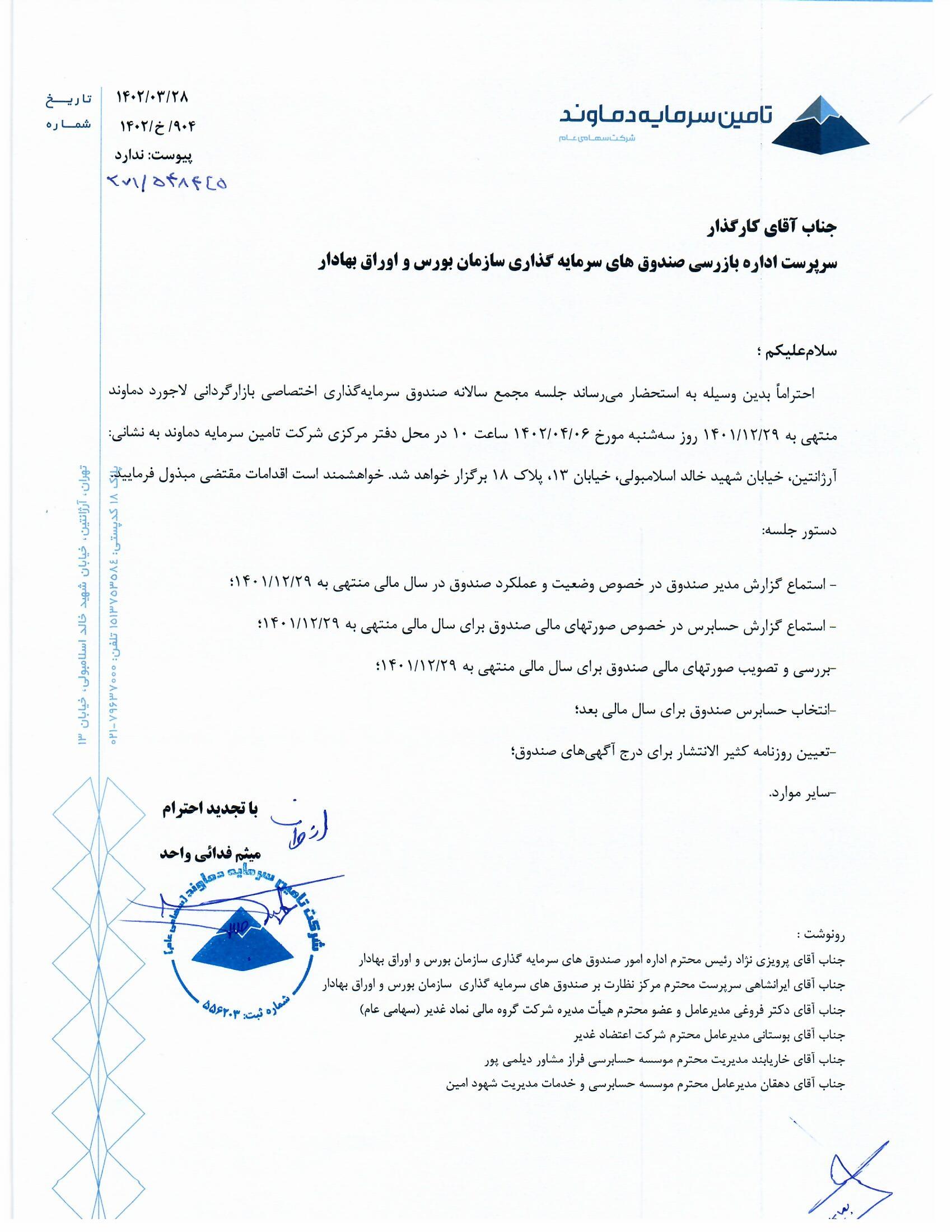 دعوت نامه مجمع صندوق بازارگردانی لاجورد دماوند مورخ ۱۴۰۱/۰۳/۰۴ جهت تغییر بند امیدنامه افزایش سقف صندوق - امیدنامه